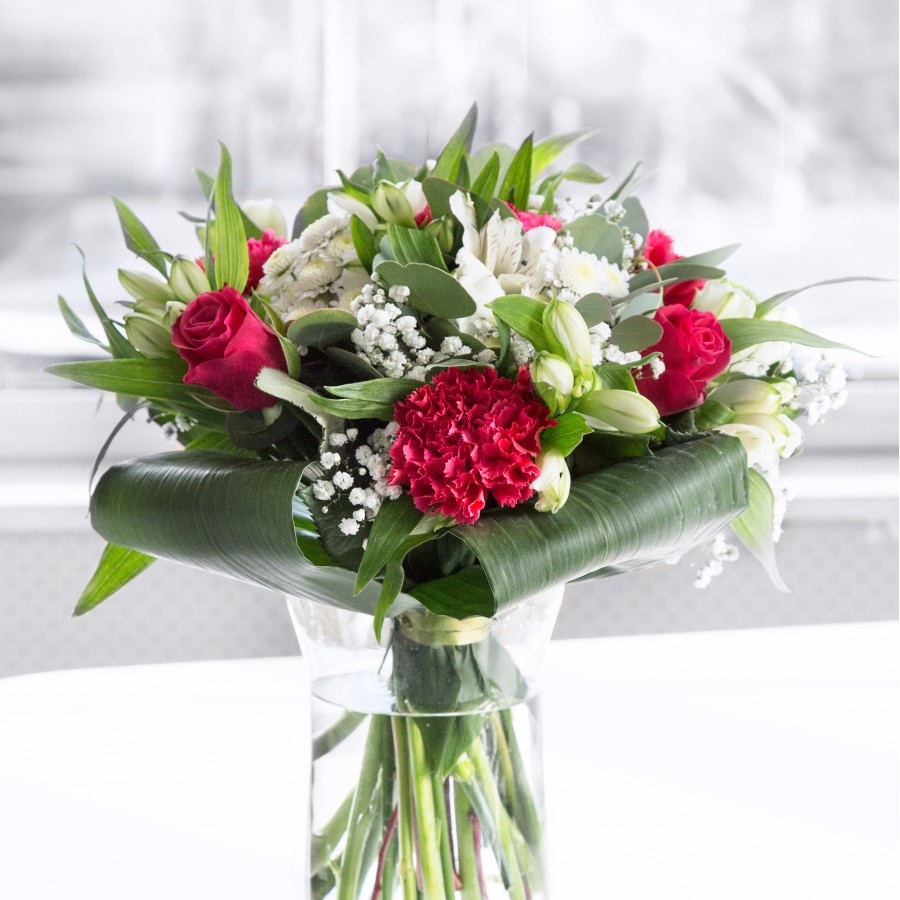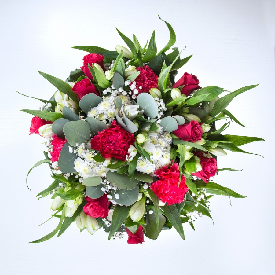 Embrace the delicate beauty and unique elegance of our floral arrangement. This charming bouquet features luxurious red roses and carnations paired with sweet white chrysanthemums and gypsophila, thoughtfully arranged with white alstroemeria and aspidistra leaves for a graceful presentation.